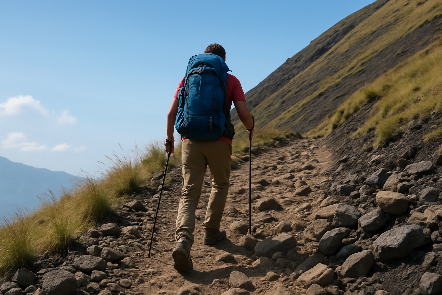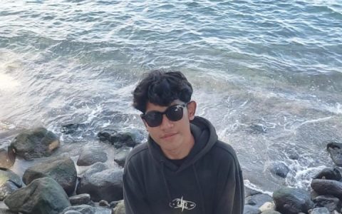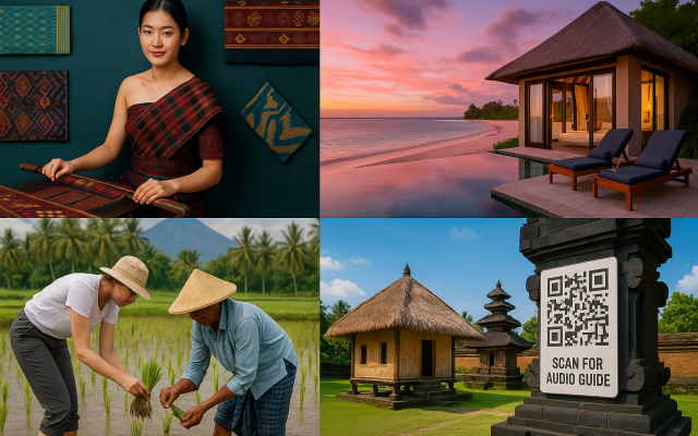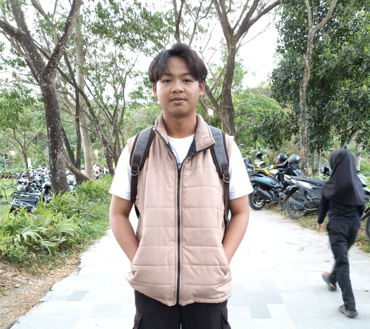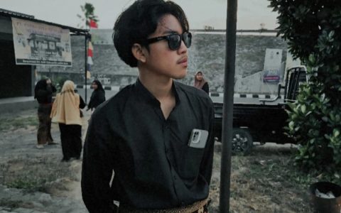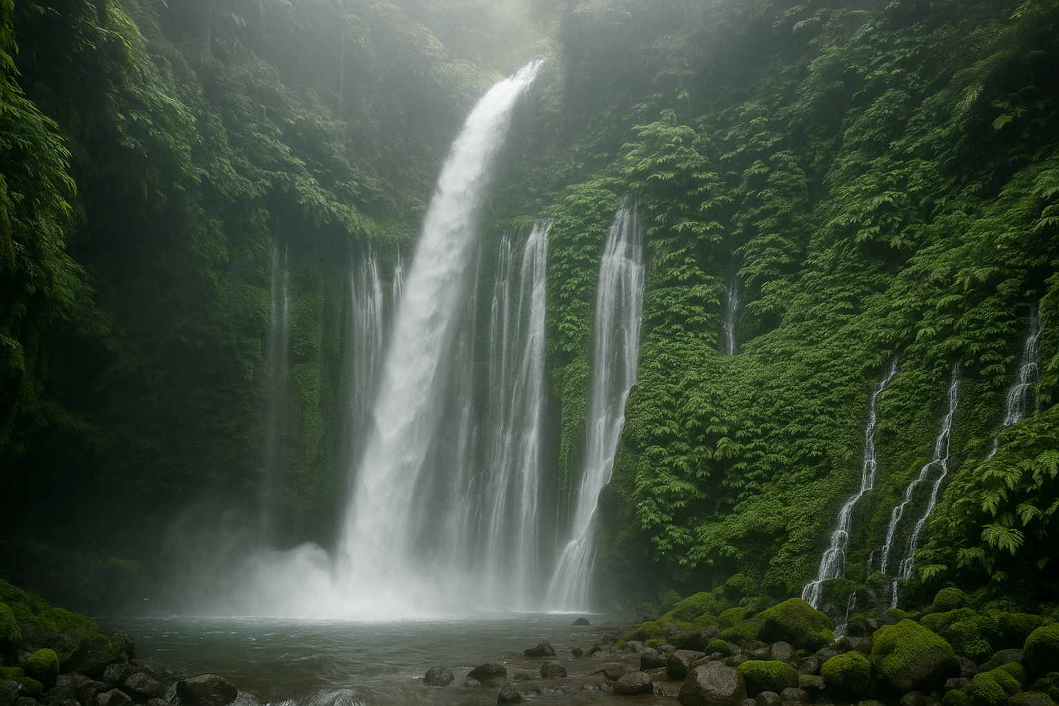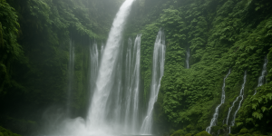 Latar Belakang: Air terjun setinggi 20 meter mengalir deras ke kolam jernih yang dikelilingi bebatuan besar dan tumbuhan pakis. Foreground: Seorang wisatawan sedang berdiri di bawah aliran air dengan pose …